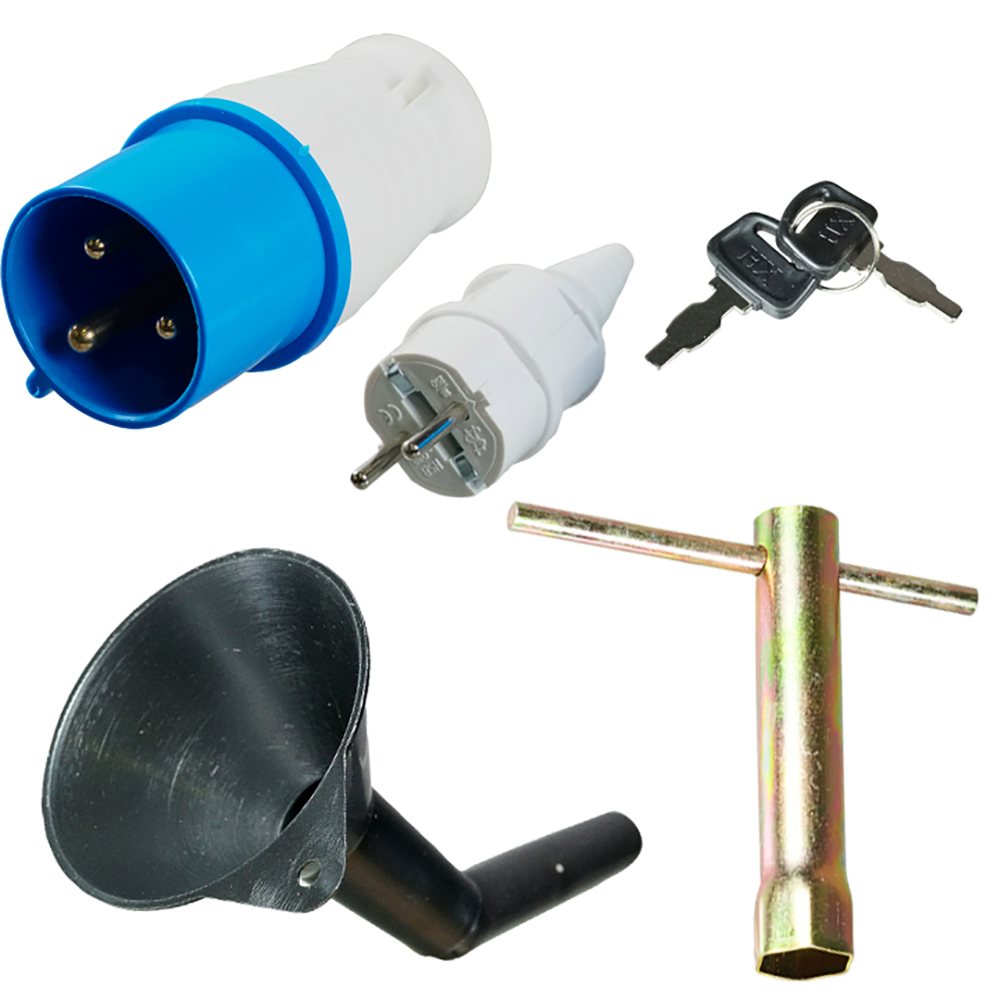 резиновые опоры – 4 шт. (уже установлены на генератор), вилка 220В/16А – 1 шт., вилка 220В/32А – 1 шт., свечной ключ c воротком – 1 шт., ключ зажигания – 2 шт., заливная воронка – 1 шт., инструкция с сервисным талоном – 1 шт.