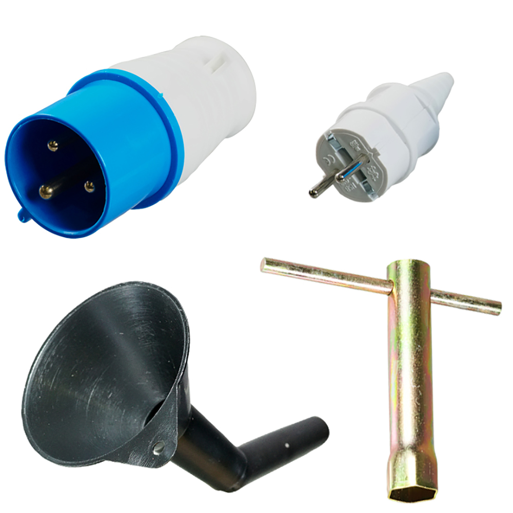 резиновые опоры – 4 шт. (уже установлены на генератор), вилка 220В/16А – 1 шт., вилка 220В/32А – 1 шт., свечной ключ c воротком – 1 шт., заливная воронка – 1 шт., инструкция с сервисным талоном – 1 шт., + Комплект колес и ручек для электростанций в ПОДАРОК