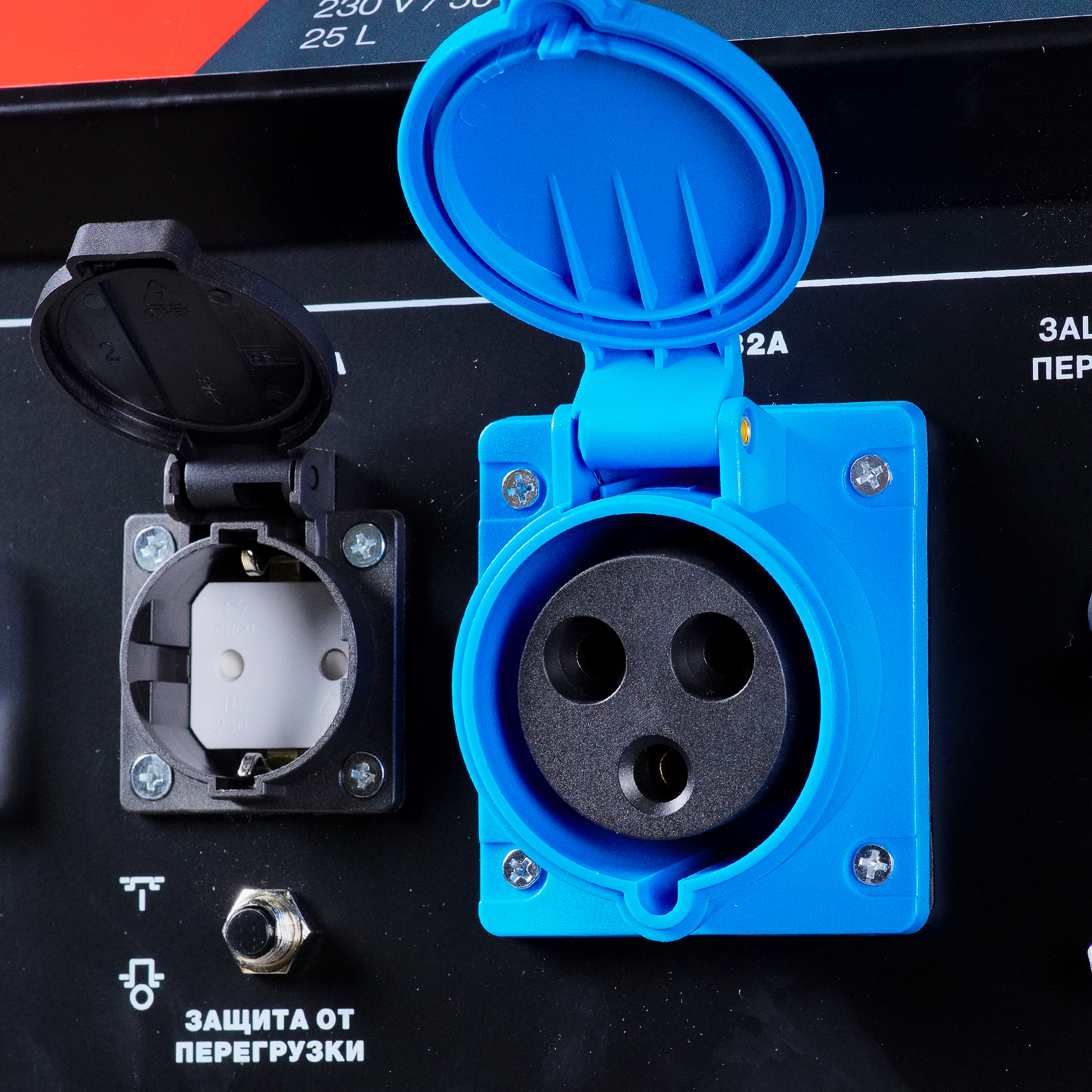 - силовая розетка 230 В / 32 А для снятия полной мощности при подключении мощных однофазных потребителей,