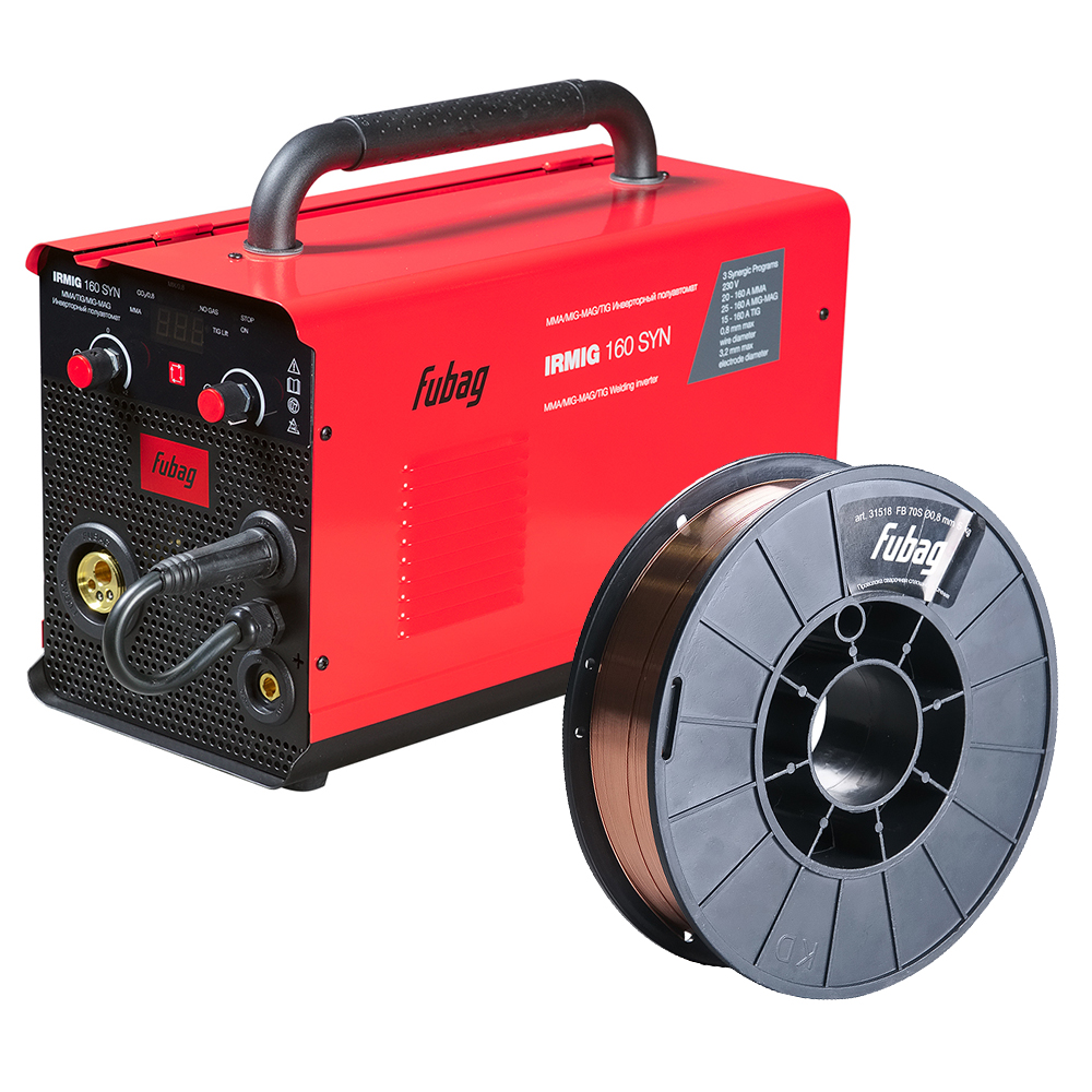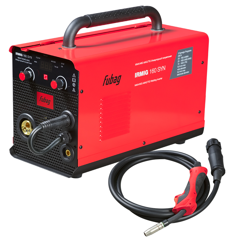Сварочный полуавтомат Fubag IRMIG 160 SYN – высокопроизводительный сварочный аппарат, который может работать в режимах ММА, MIG/MAG и TIG сварки и имеет синергетическое управление в режиме полуавтоматической сварки для проволоки диаметром 0,8 мм . Аппарат работает в самом распространенном диапазоне сварочного тока 15-160 А с проволокой диаметром от 0,8 мм, катушкой весом 5 кг и диаметром 200 мм. Высокую производительность сварочной работы обеспечивает автоматическая подача проволоки. Регулировка подачи проволоки, сварочного напряжения и индуктивности в ручном режиме позволяет настроить оптимальный режим сварки. Передняя панель оснащена регуляторами силы тока и скорости подачи проволоки, что позволяет быстро и просто выбирать режимы и оптимальные параметры сварки. Сварочный полуавтомат Fubag IRMIG 160 SYN оснащен евроразъемом для быстрого и безопасного подключения сварочной горелки. Купив сварочный инвертор IRMIG 160 SYN, вы получите в коробке фирменную горелку 250 А и газовый шланг, а также кабель с электрододержателем и кабель заземления.Продолжительность включения (ПВ) составляет 25% при 40С. Эти данные приведены в соответствии с европейским стандартом EN60974-1 при внешней температуре 40С. Часто на рынке используется значение ПВ при температуре окружающей среды 20С: чем ниже температура, тем выше ПВ.Сварочный полуавтомат Fubag IRMIG 160 SYN обладает легкой сменой полярности для работы с самозащитной проволокой. Эффективная система охлаждения, а также встроенная функция термозащиты с индикацией перегрева гарантируют долговечность и надежность использования аппарата в условиях интенсивной эксплуатации.Быстрое подключение сварочных кабелей и евроразъем для подключения горелки гарантируют удобство использования. Все технические характеристики наглядно и подробно указаны на корпусе аппарата. Сварочный полуавтомат Fubag IRMIG 160 SYN поставляется с полным набором аксессуаров для MIG/MAG и ММА сварки .В интернет-магазине fubag.ru вы можете скачать инструкцию по подключению и использованию сварочного полуавтомата Fubag IRMIG 160 SYN, а также фотографии аппарата в различных ракурсах, его характеристики и полное описание.