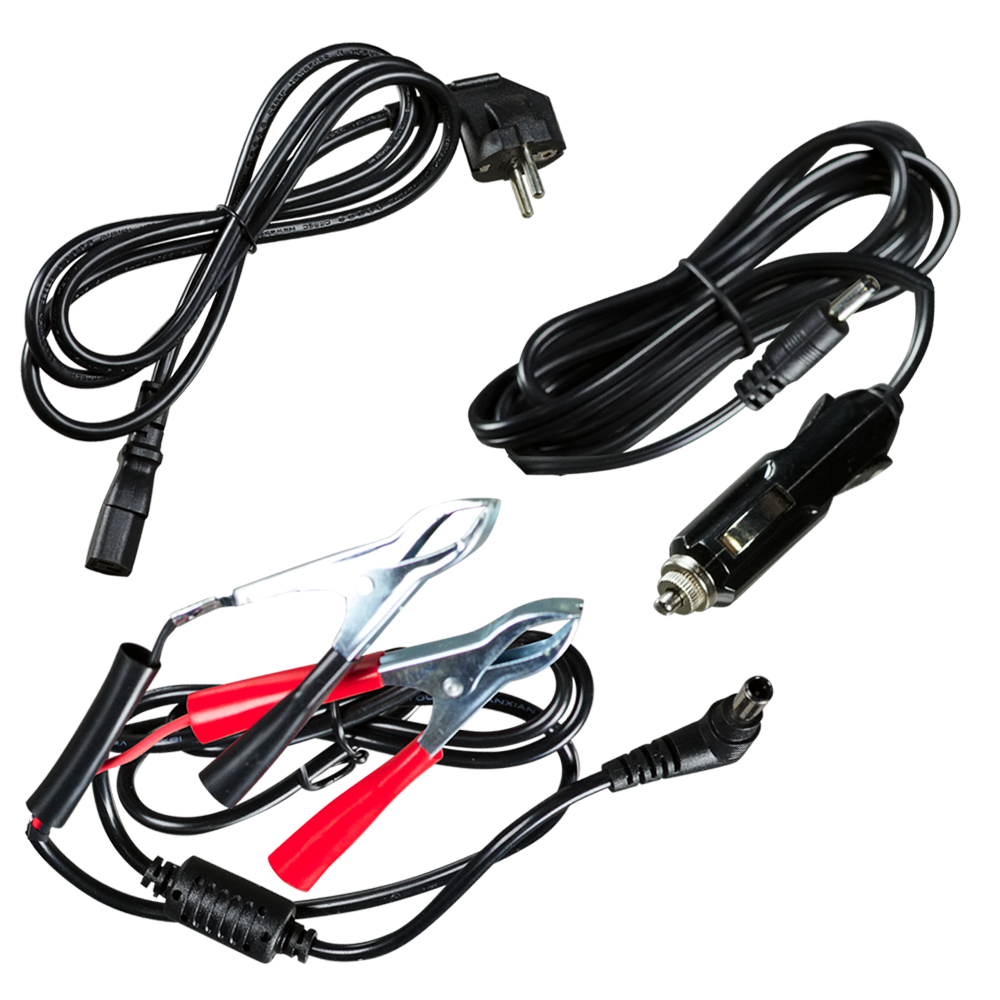 сетевой кабель с евровилкой(Schuko Type F) и вилкой IEC 60320 C13, кабель DC 12V с зажимами типа "крокодил", кабель DC 12V с адаптером для автомобильной розетки (прикуриватель) и коннектором XT60