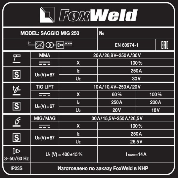 Сварочный полуавтомат FOXWELD SAGGIO MIG 250 — многофункциональный инверторный сварочный аппарат с синергетическим управлением, предназначенный для широкого использования в отраслях по производству различных металлоконструкций, где работают со сплавами стали, алюминия или меди. В источнике питания реализовано три режима сварки: MIG/MAG, TIG LIFT, ММА. Синергетическая система управления трёхфазного аппарата облегчает настройку режимов сварки и позволяет быстро настроить оборудование под любые задачи, не тратя время на дополнительные настройки сварочного процесса. Регулировка индуктивности позволяет формировать форму сварного шва и глубину проварки металла. В памяти автоматики можно создавать и сохранять 10 программ сварочных работ. Есть возможность подключения горелки Spool Gun. В конструкции рамы сварочного аппарата есть площадка для крепления баллона с газом. В пространство для размещения проволоки можно установить катушку диаметром D300. На задней панели расположена розетка 36 В для подключения подогревателя газа, который необходим для защиты обледенения редуктора во время продолжительной работы.